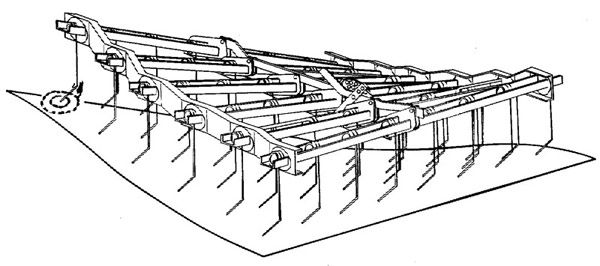 Brana z trojno vzmetenim zobovjem ima posebno oblikovano ogrodje in posamezne na verigah obešene skupine bran z vzmetenim zobovjem. Posamezne brane imajo po šest vrst premakljivih prečnikov z zobovjem. Teh šest prečk brane spravimo v potrebno poševno pozicijo s posebno ročico. Nastavni kot (se pravi agresivnost oz. pritisk zobovja) zobovja se lahko centralno nastavlja na vsaki skupini (10 možnosti).